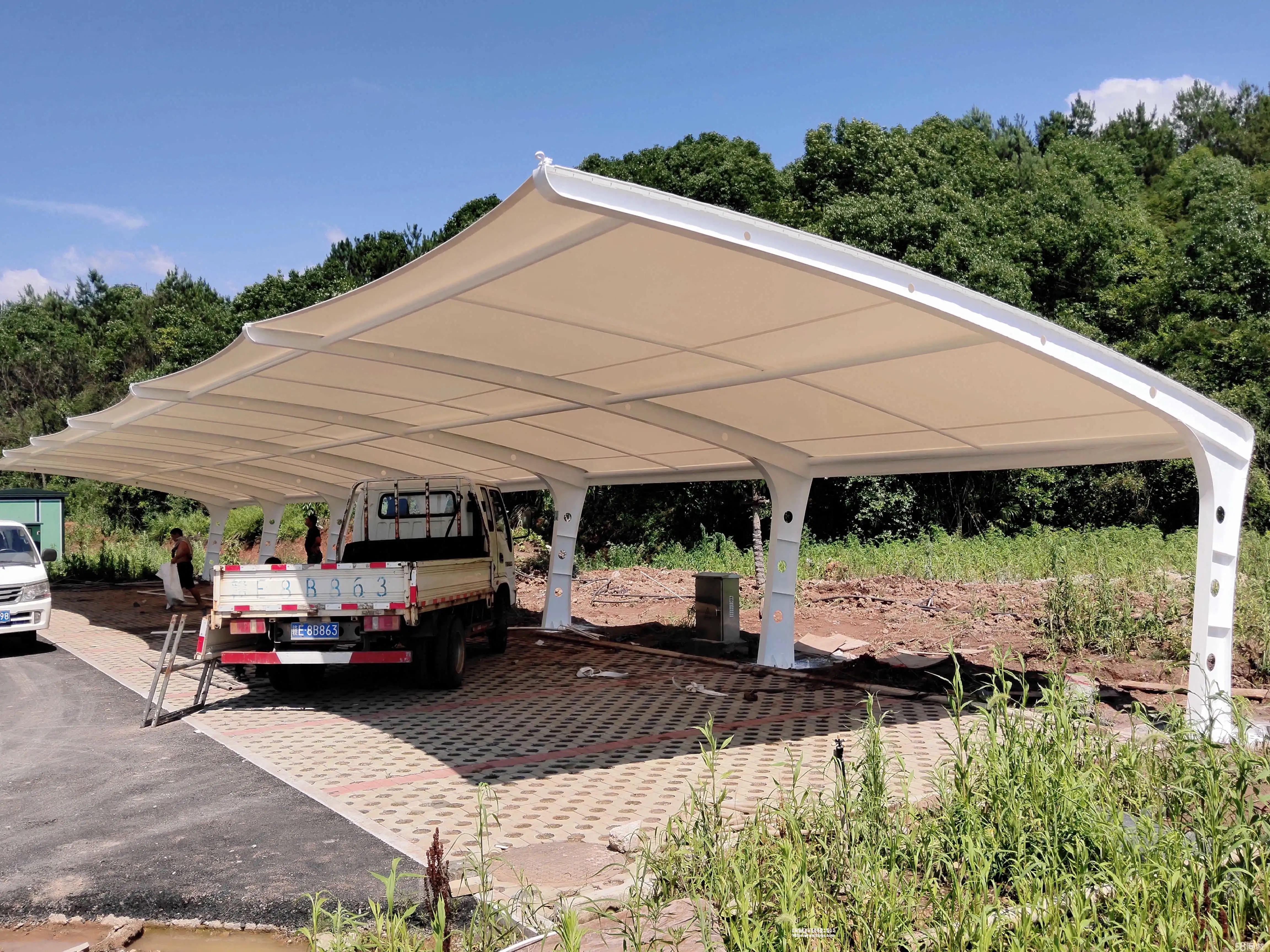 膜结构汽车停车棚详细介绍膜结构停车棚是一种特殊的建筑结构,用于提供车辆停放的临时或永久遮阳和保护。它